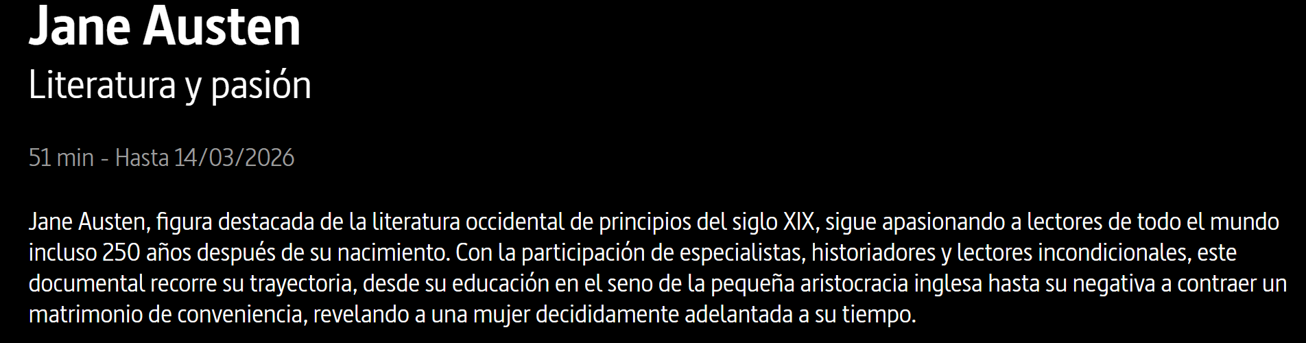 por ateleusviernes, 19 diciembre, 2025viernes, 19 diciembre, 2025Deja un comentario en Jane Austen – Literatura y Pasión https://www.arte.tv/es/videos/126243-000-A/jane-austen/ . Y no te pierdas todas las novedades en https://www.ateleus.com